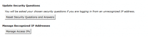 The first allows you to reset the questions and answers so that you will then be asked to set new ones the next time you login into cPanel and the second allows you to manage the Allowed IP addresses – you can add or remove any IP addresses you wish from the list as shown below.